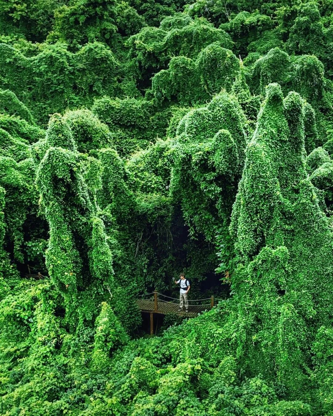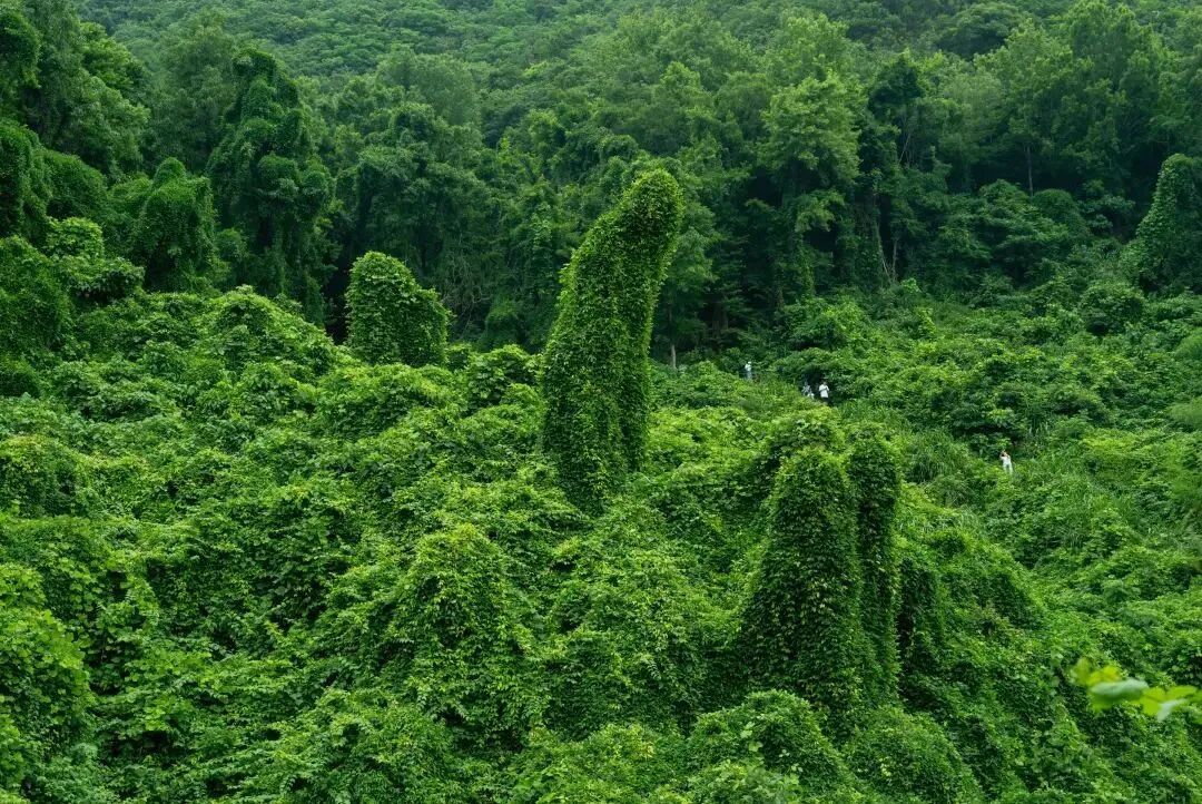 每年5月到9月,整个山头都被油麻藤占领,它们形态各异,像一座座绿色的城堡,仿佛闯进童话世界,绿野仙踪。